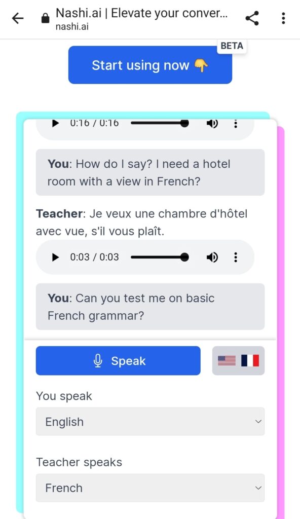 The Nashi.AI site itself was quite simple to use. I selected French as my learning goal and this is how my conversation basically went
